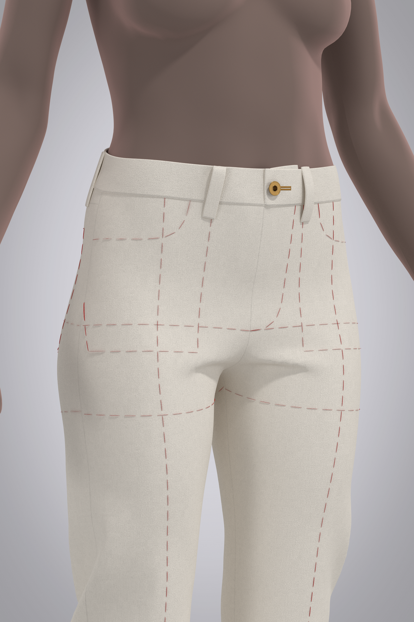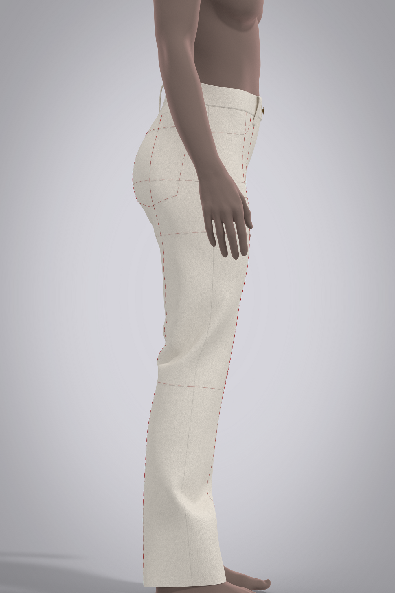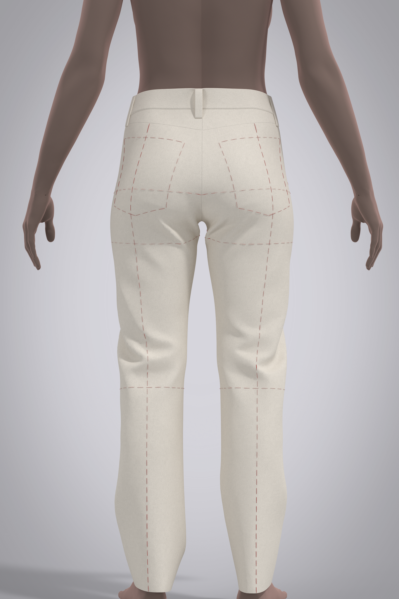 Jean pattern block or 3D "starter garment," fit on female avatar. Silhouette is slim, straight leg traditional jean cut with back yoke and straight waistband. All details such as pockets, pocket bags and fly are marked as reference lines on the body pattern. Pattern is designed for stretch denim, recommend sizing up for rigid denim. Refer to Fit tab for sizing details and ease.
