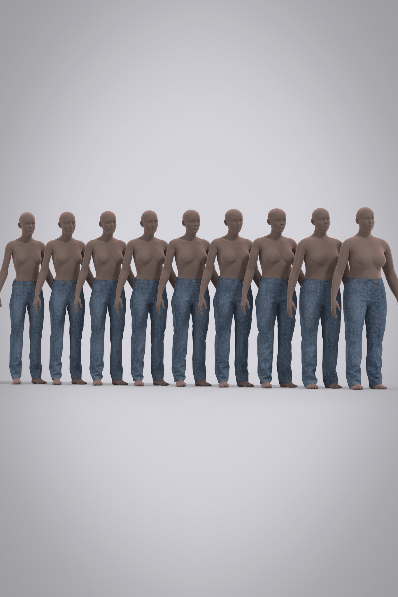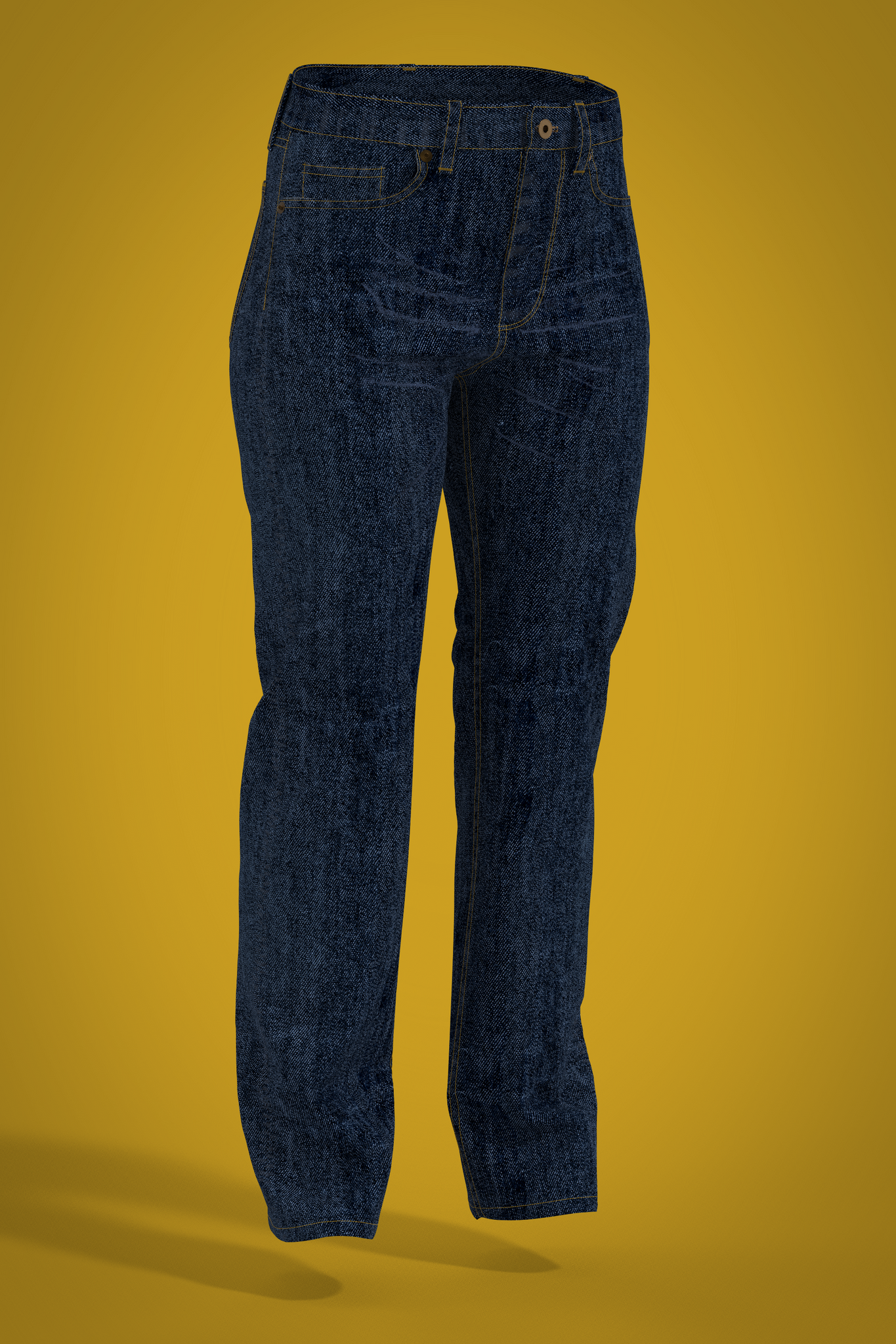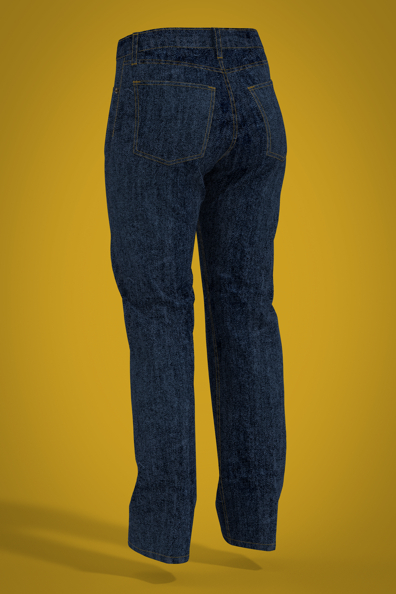 Jean pattern block or 3D "starter garment," fit on female avatar. Silhouette is slim, straight leg traditional jean cut with back yoke and straight waistband. All details such as pockets, pocket bags and fly are marked as reference lines on the body pattern. Pattern is designed for stretch denim, recommend sizing up for rigid denim. Refer to Fit tab for sizing details and ease.